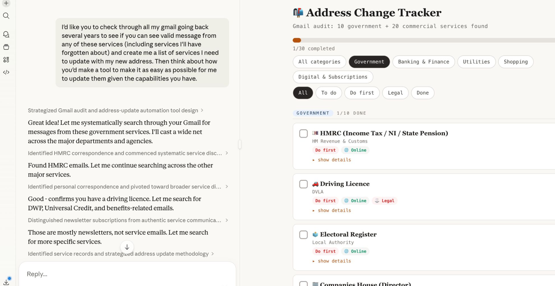This morning I’ve been playing with using an AI Agent (Claude Cowork) to do the hard work of updating my address across all public services which matter to me. I linked Cowork to my email archive, then gave it this prompt: